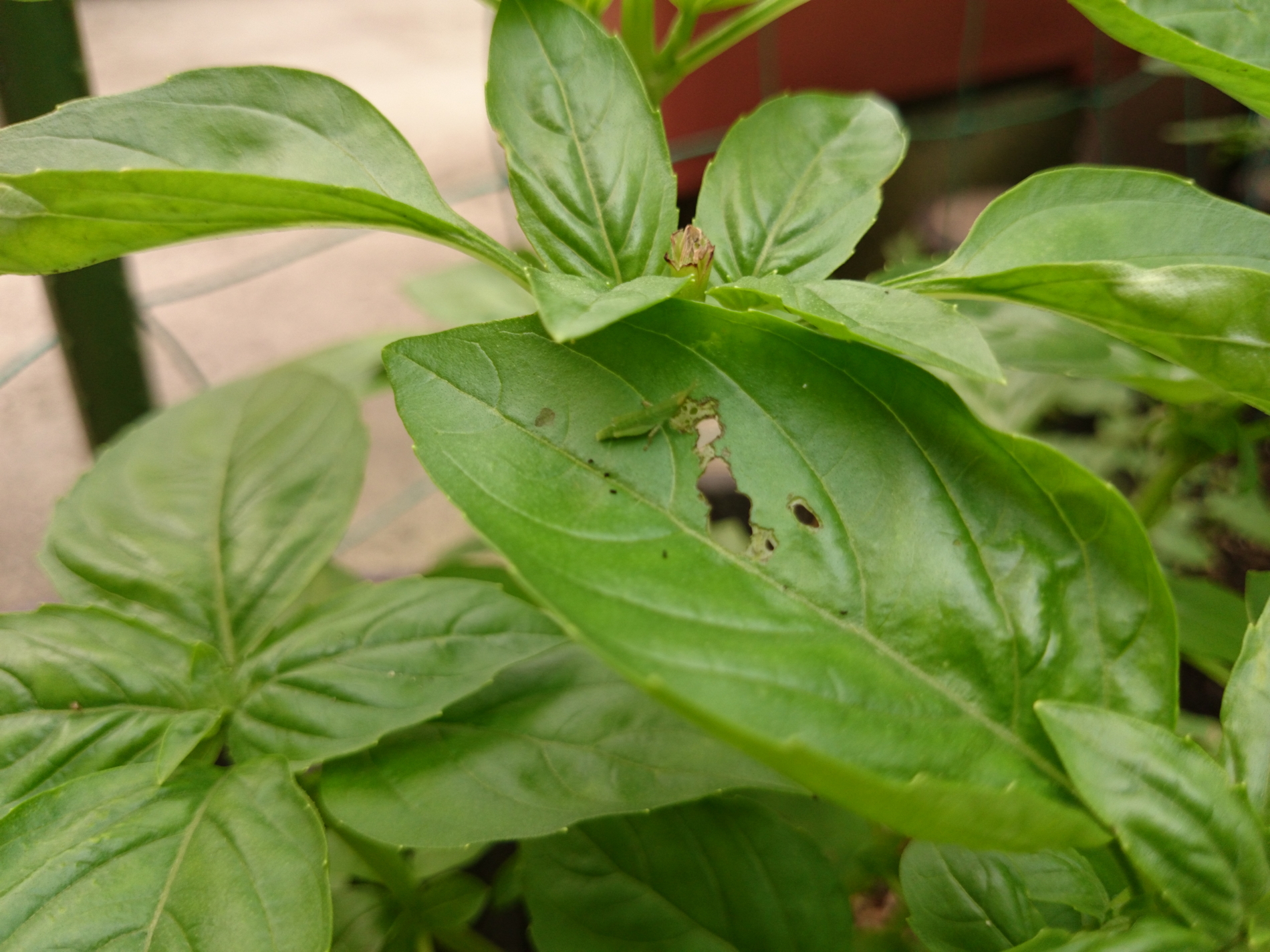 見えますか? 真ん中にバッタの赤ちゃん。食欲旺盛で困ります。