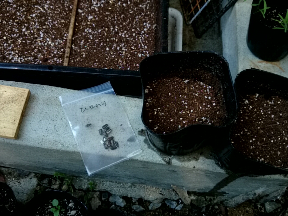 ヒマワリの種は、ポットに2~3粒ずつ