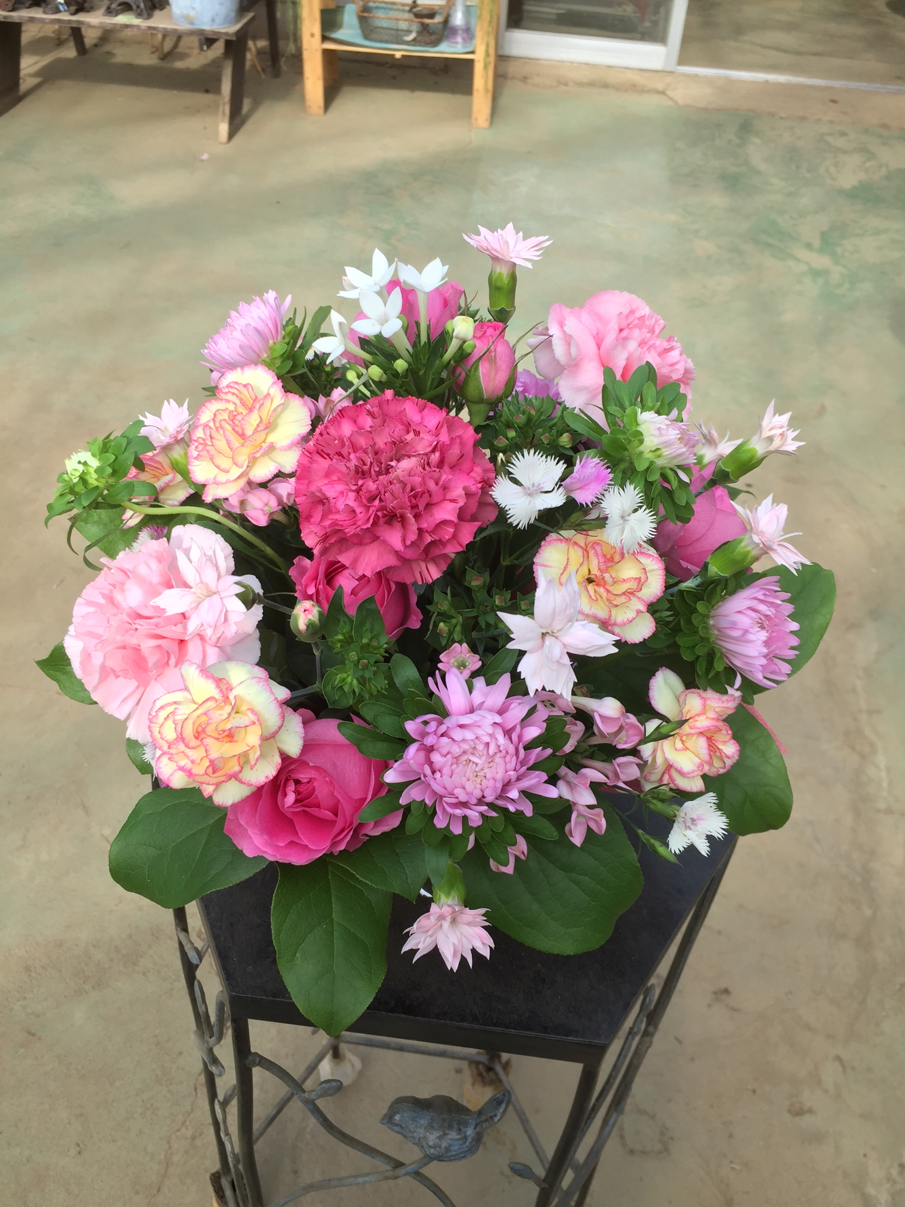 カーネーションと剣咲きスプレーカーネーション、ナデシコを入れておちついたかんじで