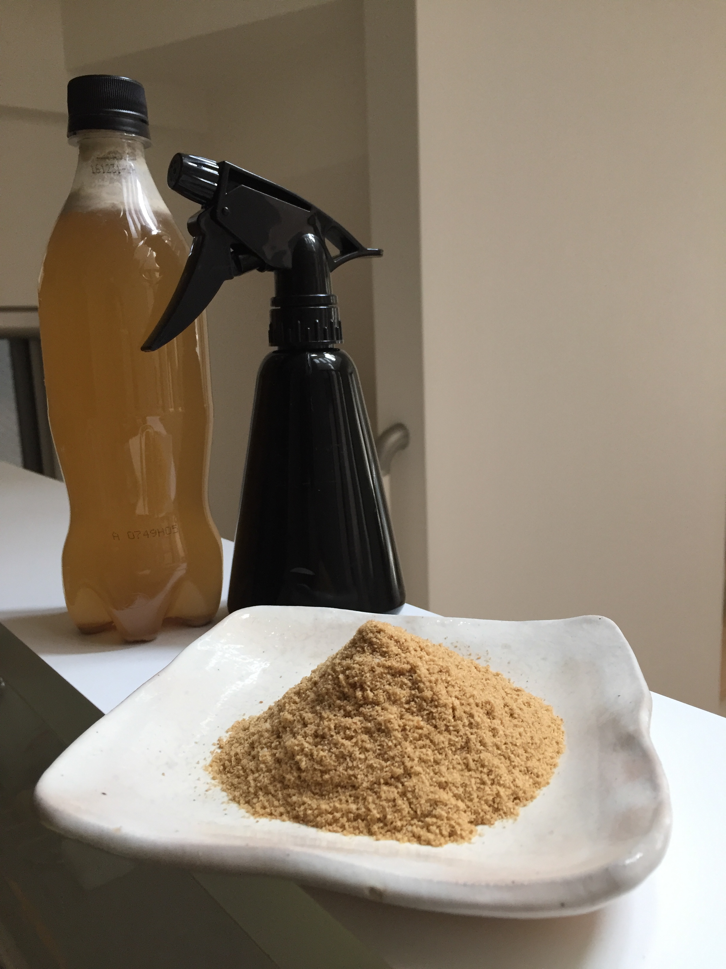 手前は米ぬか。奥のスプレーはお酢の水溶液。我が家の常備品。